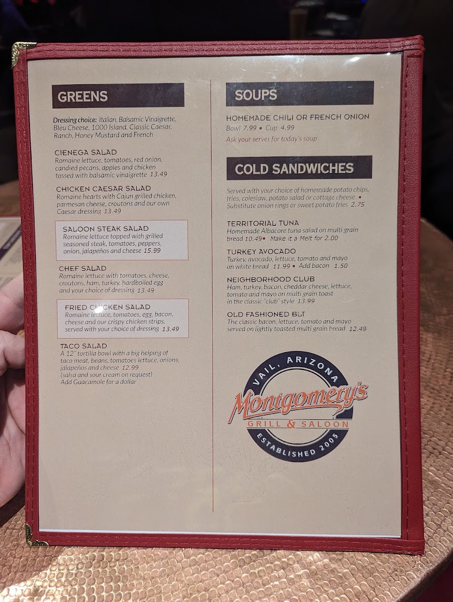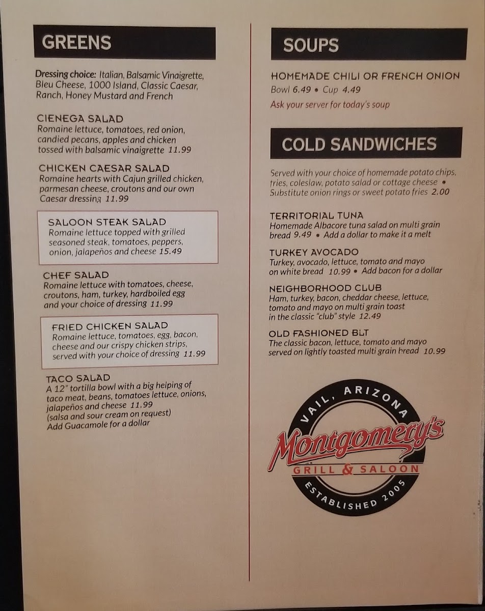 Montgomery's Grill & Saloon offers a laid-back American menu designed for casual dining and relaxed gatherings. The selection features comforting bar & grill favorites that pair well with the warm, inviting atmosphere of this Vail spot. Whether stopping by for a midday lunch or winding down over dinner with friends, the menu's familiar dishes fit naturally into moments meant to be savored at a calm pace.